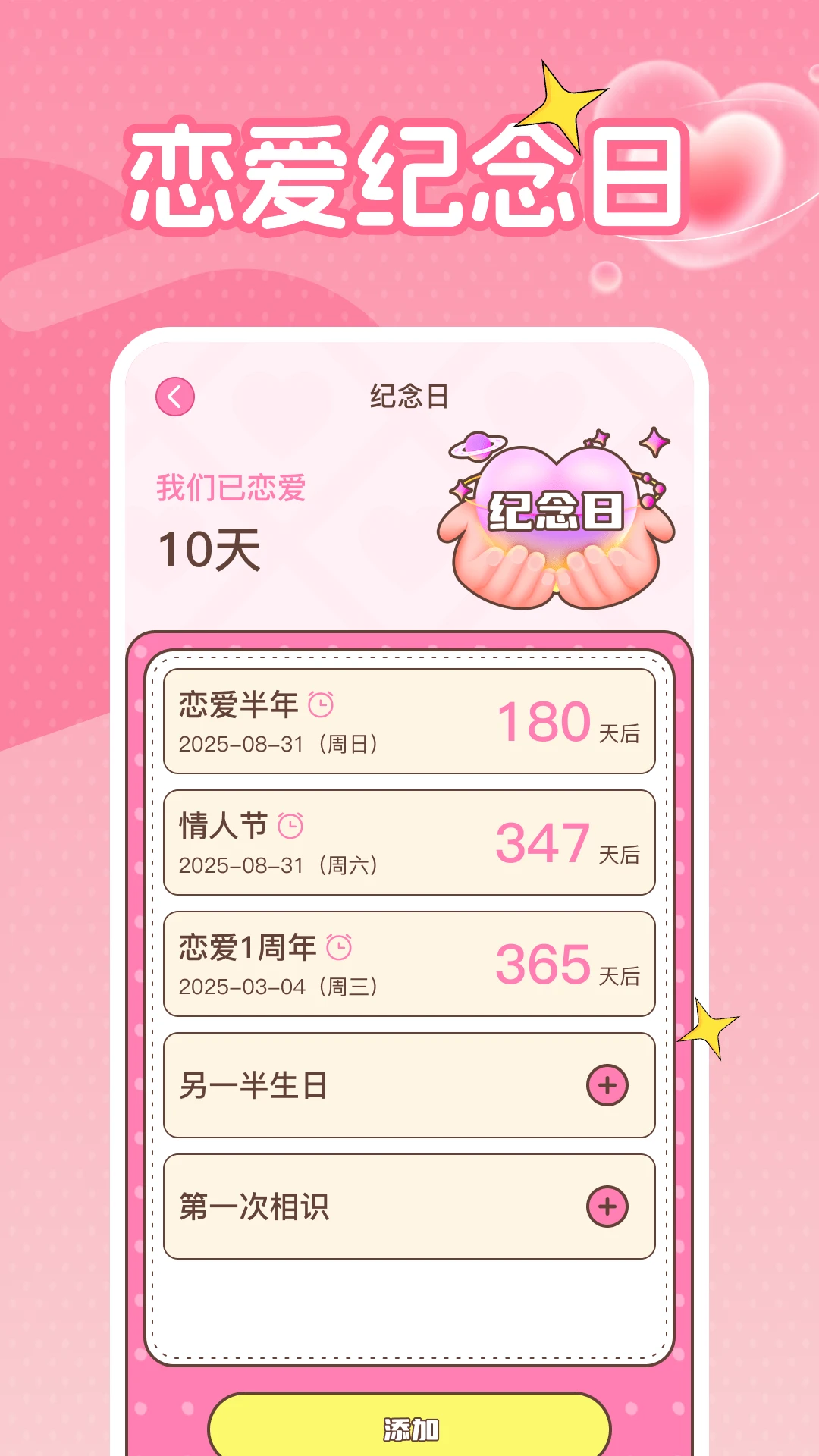 内置纪念日提醒功能,重要日子不再错过,让爱情充满仪式感。