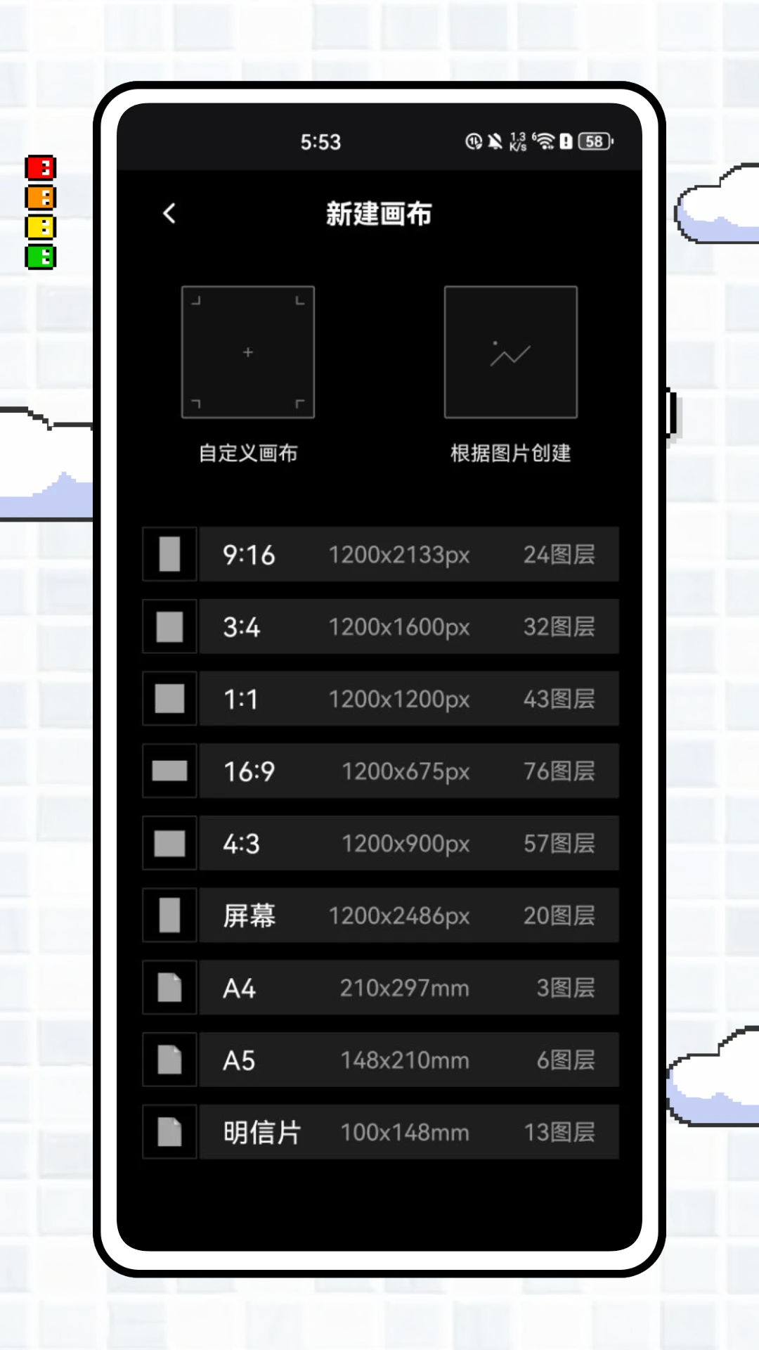 自定义画布功能,支持调整尺寸和分辨率,适应各种创作场景