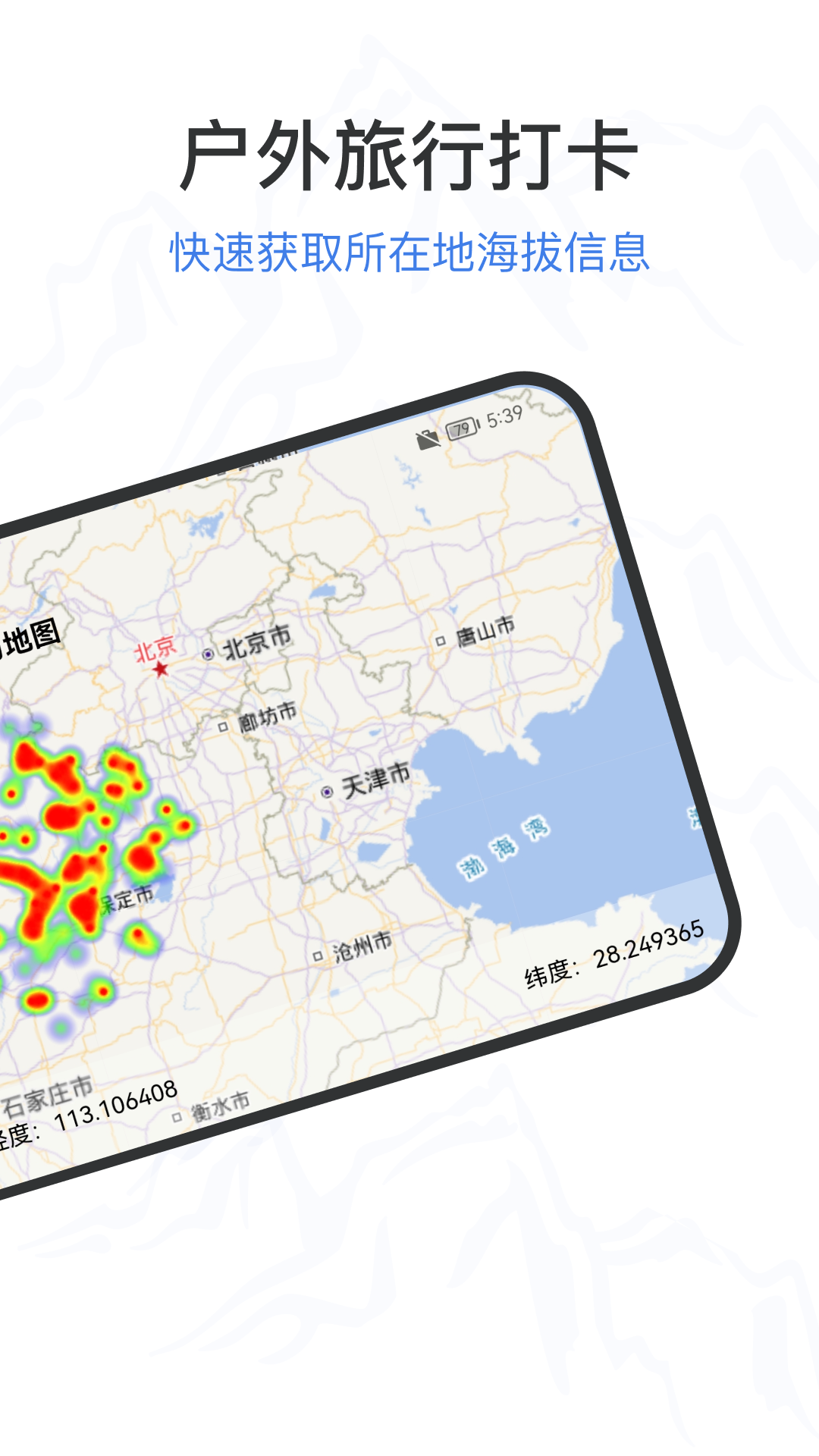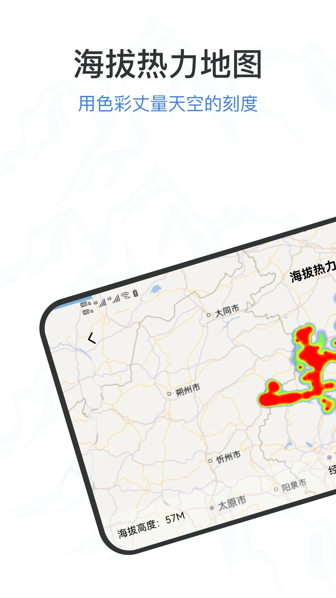 测海拔高度是一款集海拔高度测量、精准经纬度定位、实时天气查询于一体的户外工具APP。可快速获取当前海拔数据并生成动态热力图,每一个红点,都是一份信任,20万份信任汇聚成一个海拔热力图!