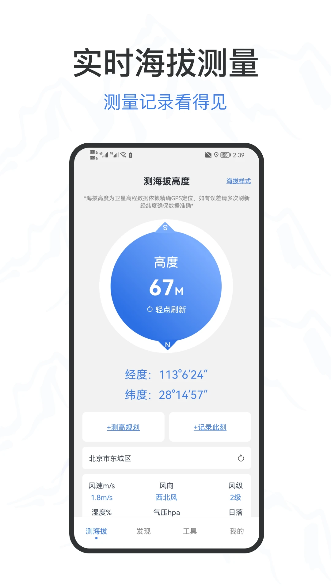 精准测量海拔高度,实时显示经纬度、天气、风速、风向、湿度等信息。简易版、地图版、极简版三种模式任意切换。
