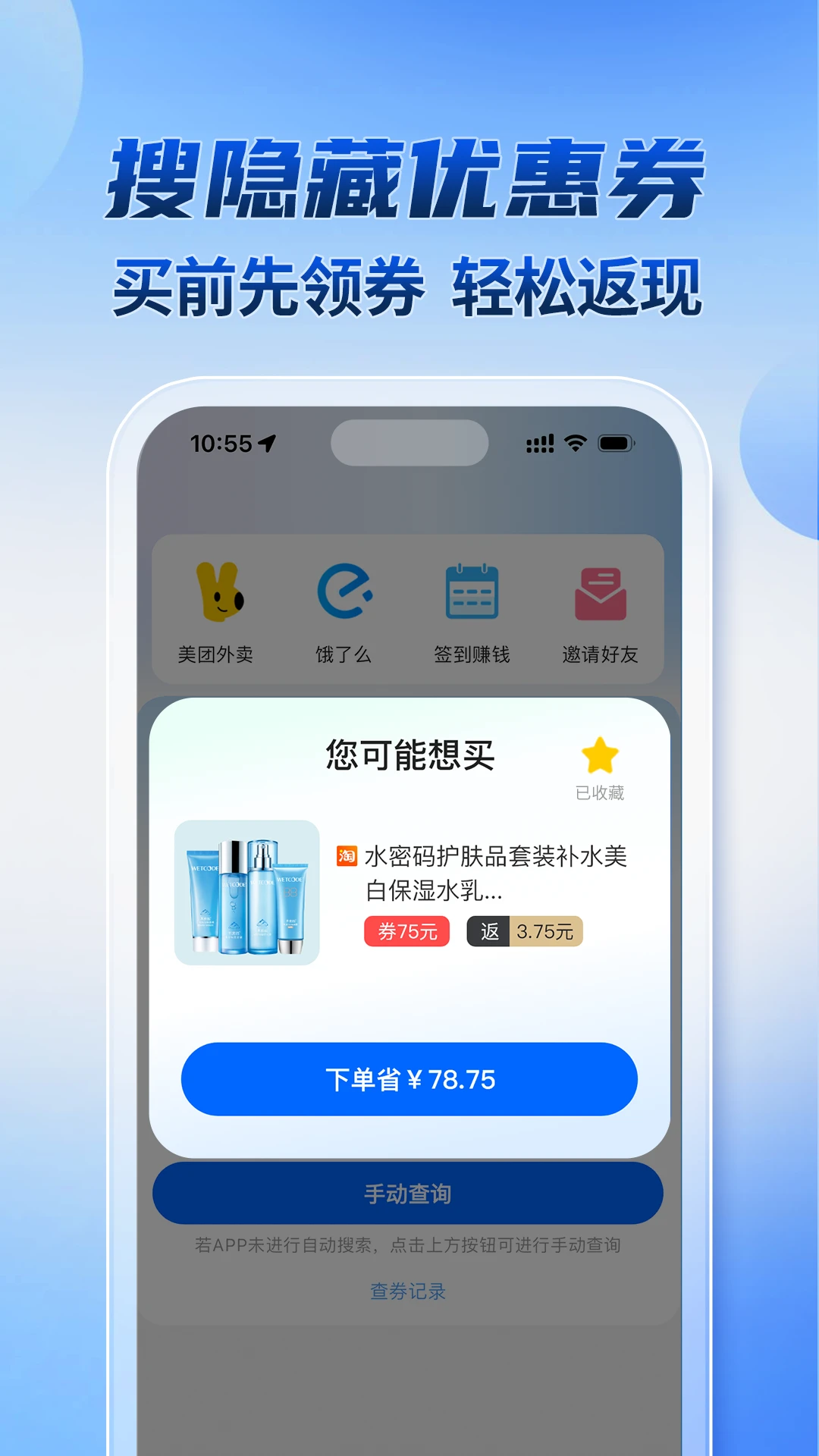 操作简单便捷:界面设计简洁,一键领取优惠券,返利自动到账。