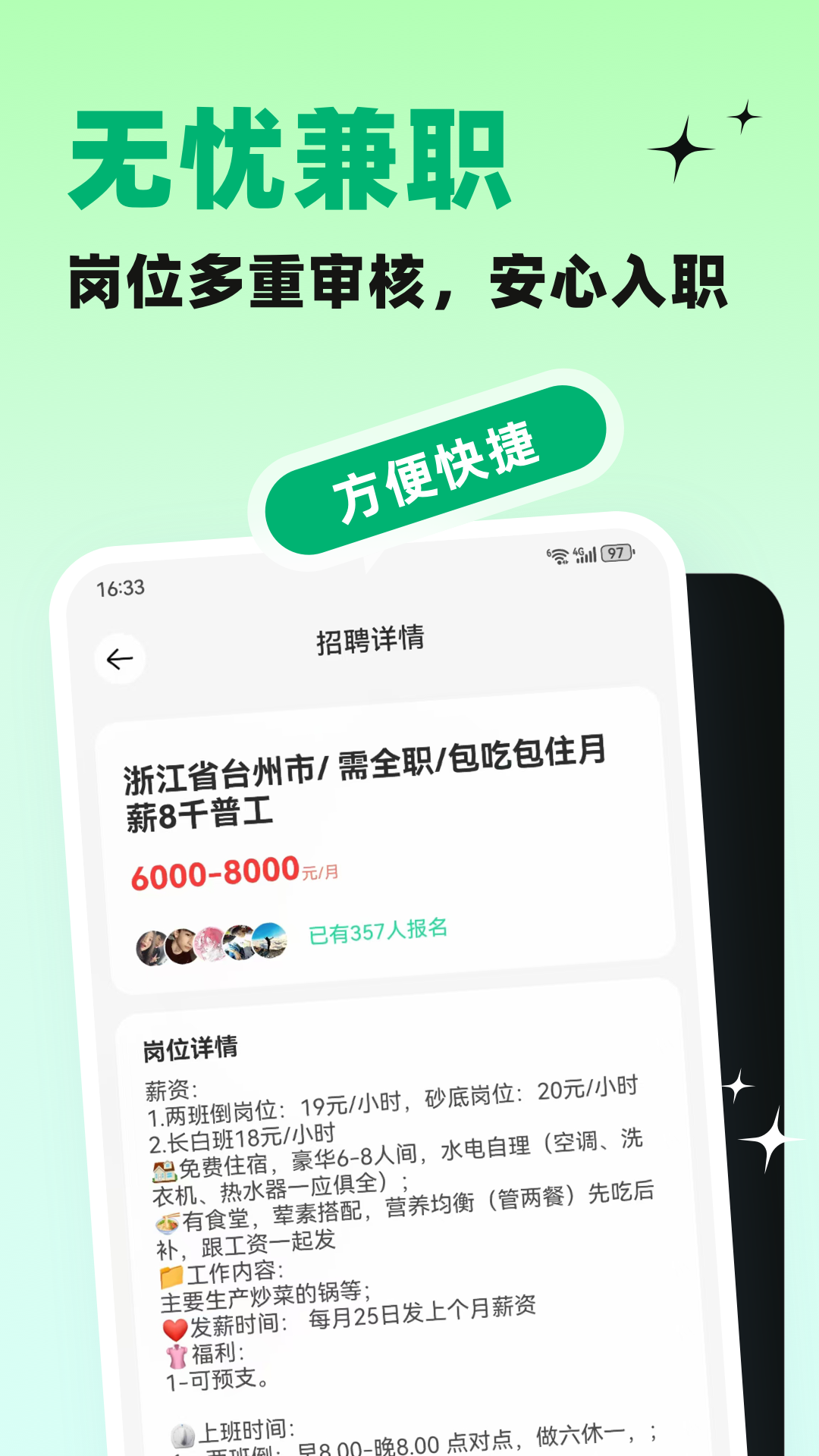 天天赚兼职是一款专注于为用户提供真实可靠、安全便捷的兼职求职服务的招聘软件。该平台致力于帮助求职者快速找到合适的兼职工作,同时为商家提供高效的招聘渠道,打造一个值得信赖的兼职求职生态系统。