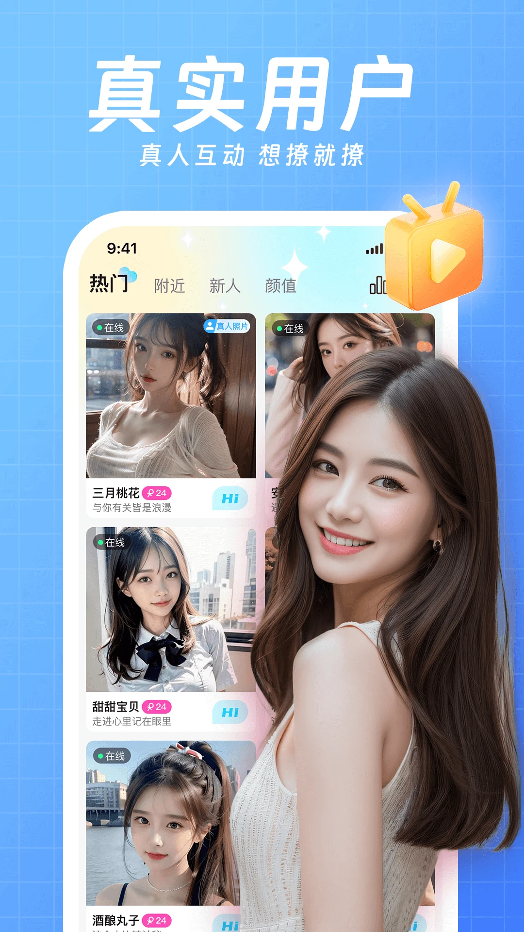 【真实高效】实名认证,真人认证,视频认证,点击头像即可见到你喜欢的TA,一键开启语音视频聊天,随时随地交友处cp!