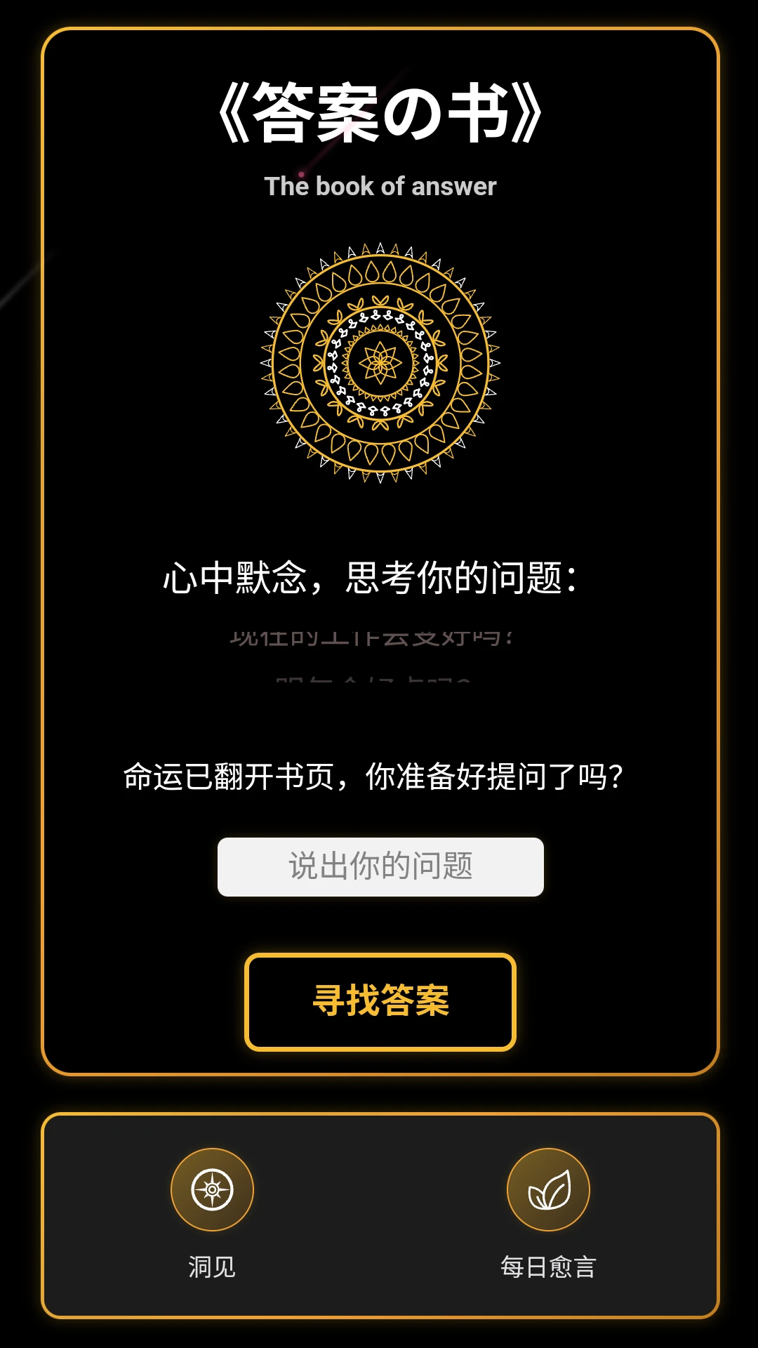 《答案之书》是一款融合心灵疗愈与决策辅助的创意应用,灵感源自维特根斯坦的哲学思考。它以简洁而深邃的方式,为用户提供情感支持与生活指引。无论是面对日常困惑还是人生重大抉择,用户只需随机翻开虚拟书页,即可获得富有哲理的答案或温暖寄语。这款应用通过专题解析、多维洞见和每日治愈内容,帮助现代人在快节奏生活中找到内心平衡,其独特的交互设计和心理学基础,让每一次翻阅都成为自我探索的旅程。