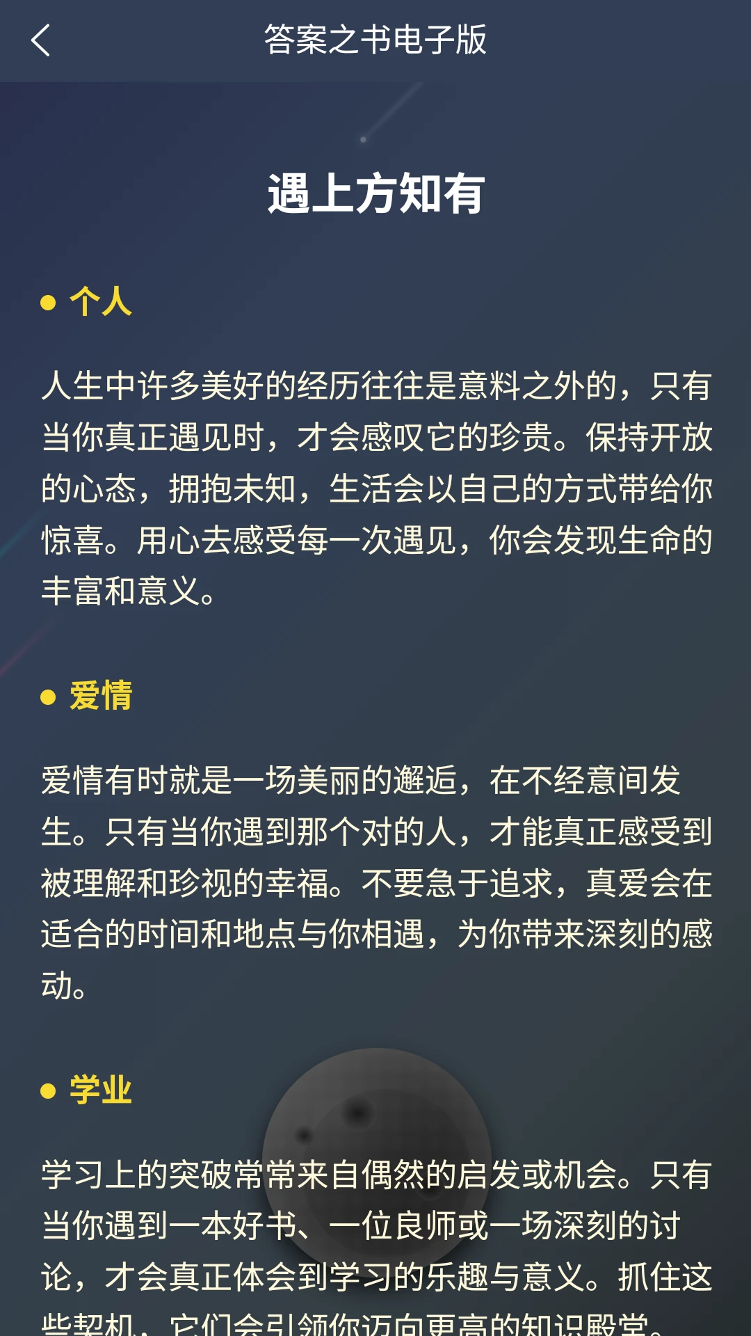 面对事业、感情、未来等重要抉择时,《答案之书》特别设计了贴近生活的专属答案与深度解析,像一场温柔的心理疗愈,陪你一起做出勇敢的选择。
