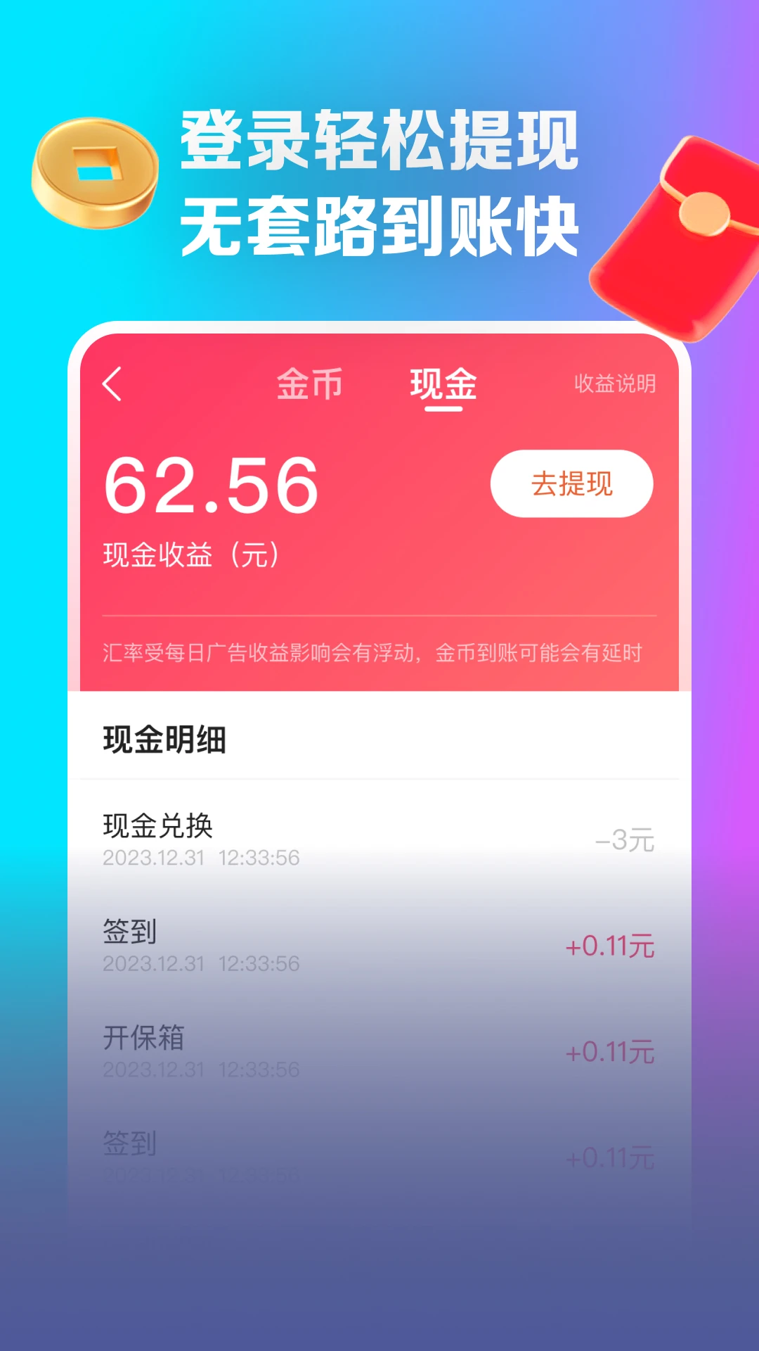 任务系统丰富多样,每日签到、邀请好友等任务助力用户快速赚取现金。
