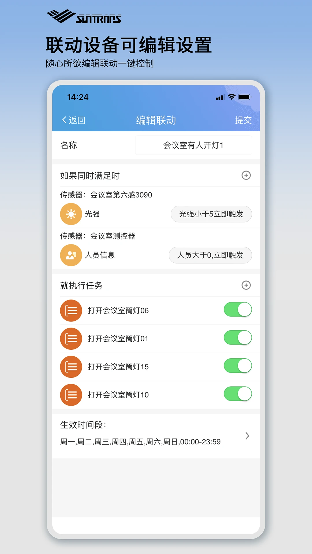自动化设备联动设置,可自定义场景模式,如上班自动开启办公设备。
