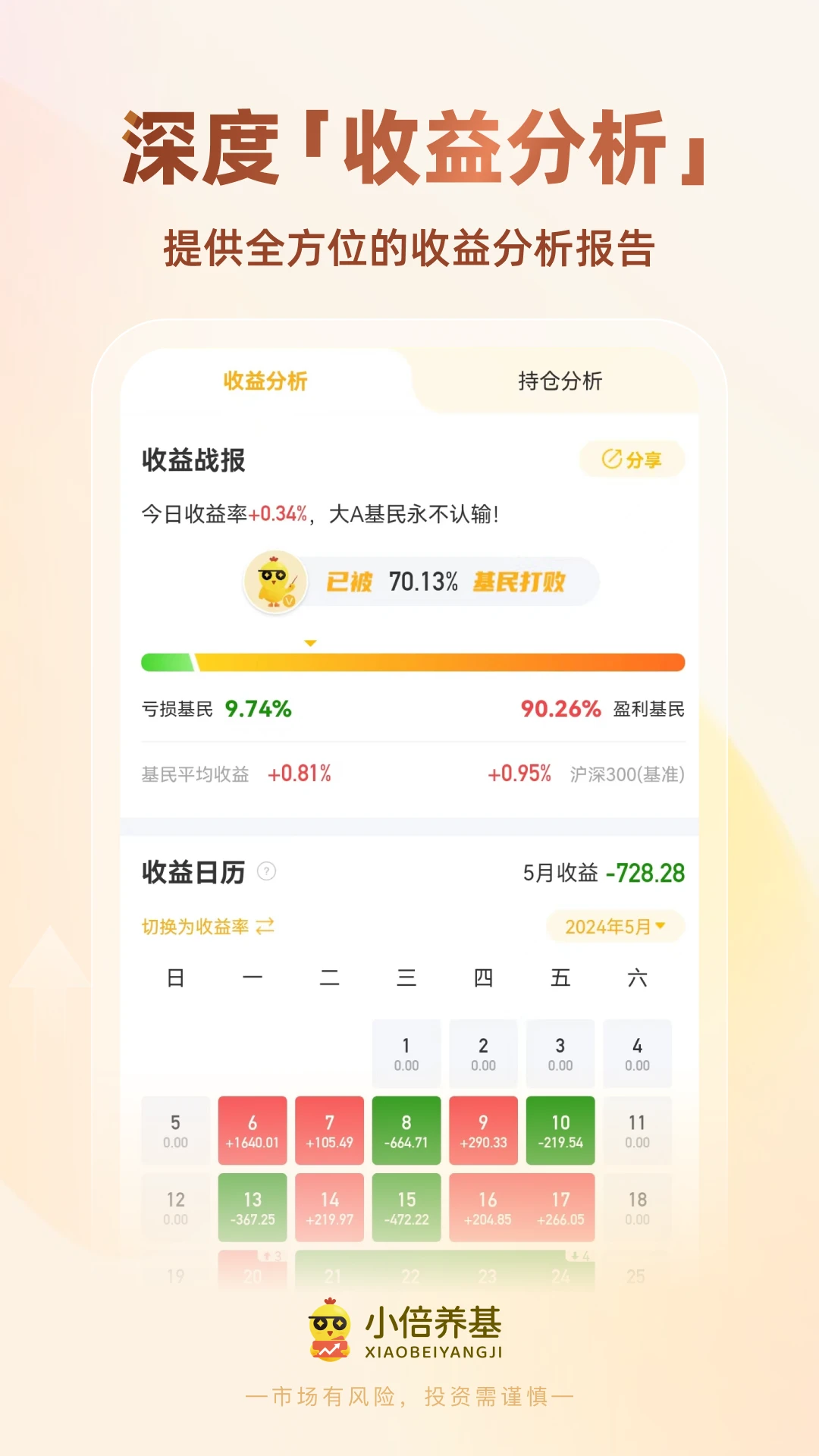 小倍养基是一款专业的基金估值、净值估算、实时估值查询平台。实时估值:每天9点开始,可以实时查看基金实时涨跌和实时收益,操作上更灵活。多账户同步:如果你在多个平台购买了基金,可通过截图识别快速汇总到小倍养基,统一管理。基金加仓榜:实时统计当日所有基民加减仓行为数据,包含加仓榜、减仓榜、涨幅榜、跌幅榜。智能提醒:能够实时提供盘中涨跌提醒、连涨连跌提醒、净值更新提醒,不再错过机会。养基工具:提供智能定投、基金扫雷、主力动向、测回本时长、测盈利概率等30多个工具。