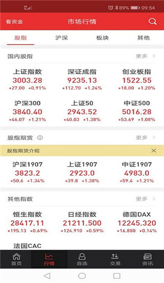 进入软件首页后,可以查看:自选股、分类排行、委托交易、大盘指数等;