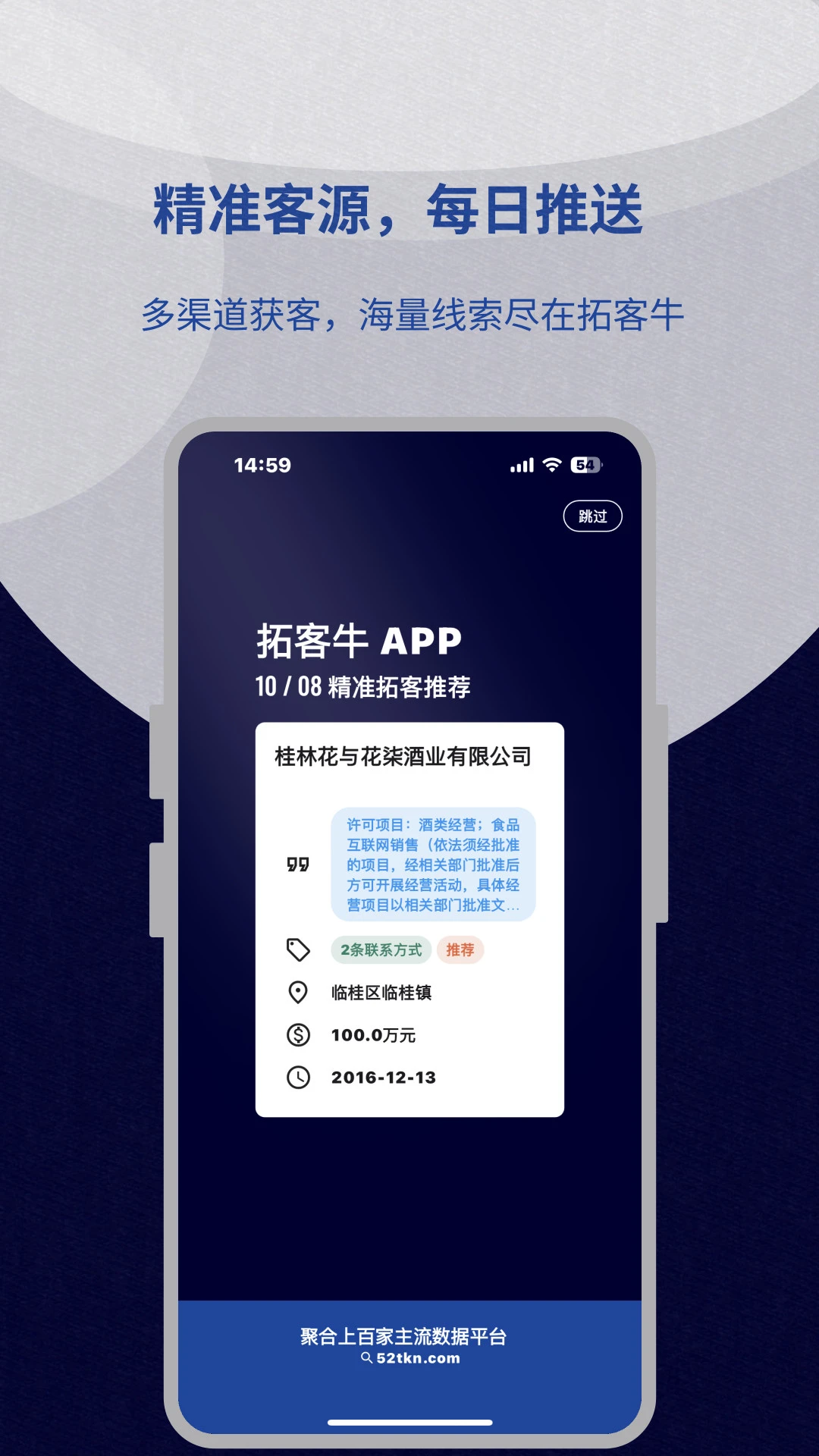 拓客App已备好10,000W+线索,每日轮循维护800W+数据,总能找到您的客源。