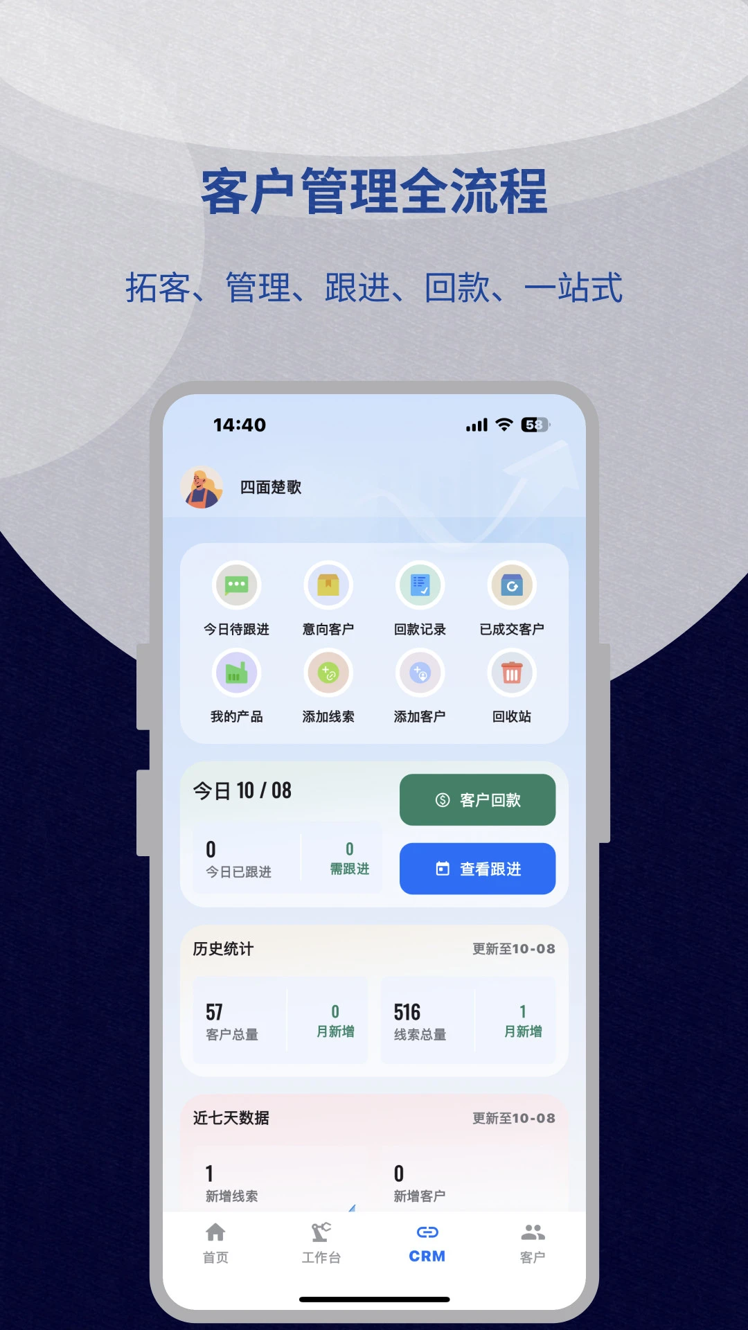 客户关系管理:提供完整的CRM功能,包括跟进记录、客户分类、标签管理等。