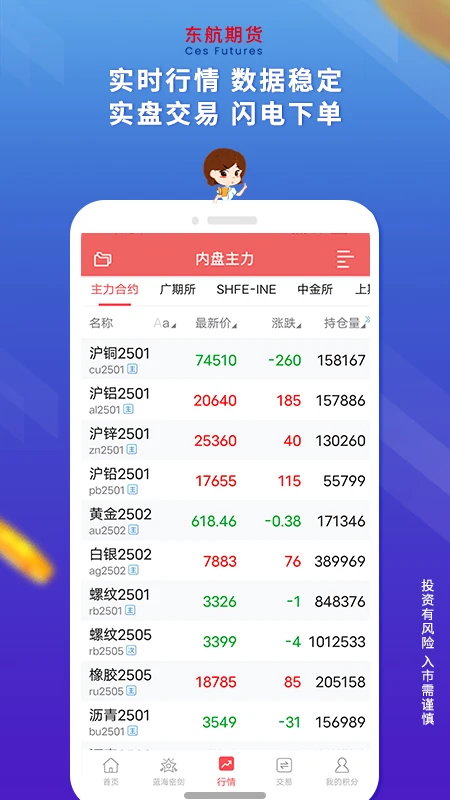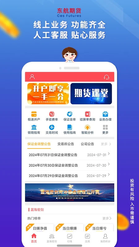 东航期货APP提供全品种期货开户服务,支持能源化工、贵金属等六大类近百种合约,用户可在线完成身份认证、风险测评等流程。