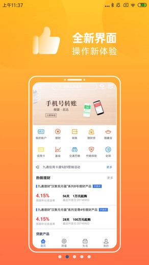 创新推出"理财贷"线上信用贷款产品,全流程线上操作,最快30分钟到账,最高可贷30万元。同步上线九通惠享存产品,A款享受阶梯利率优惠,B款采用累进利率机制,存款金额越大享受的利率越高。