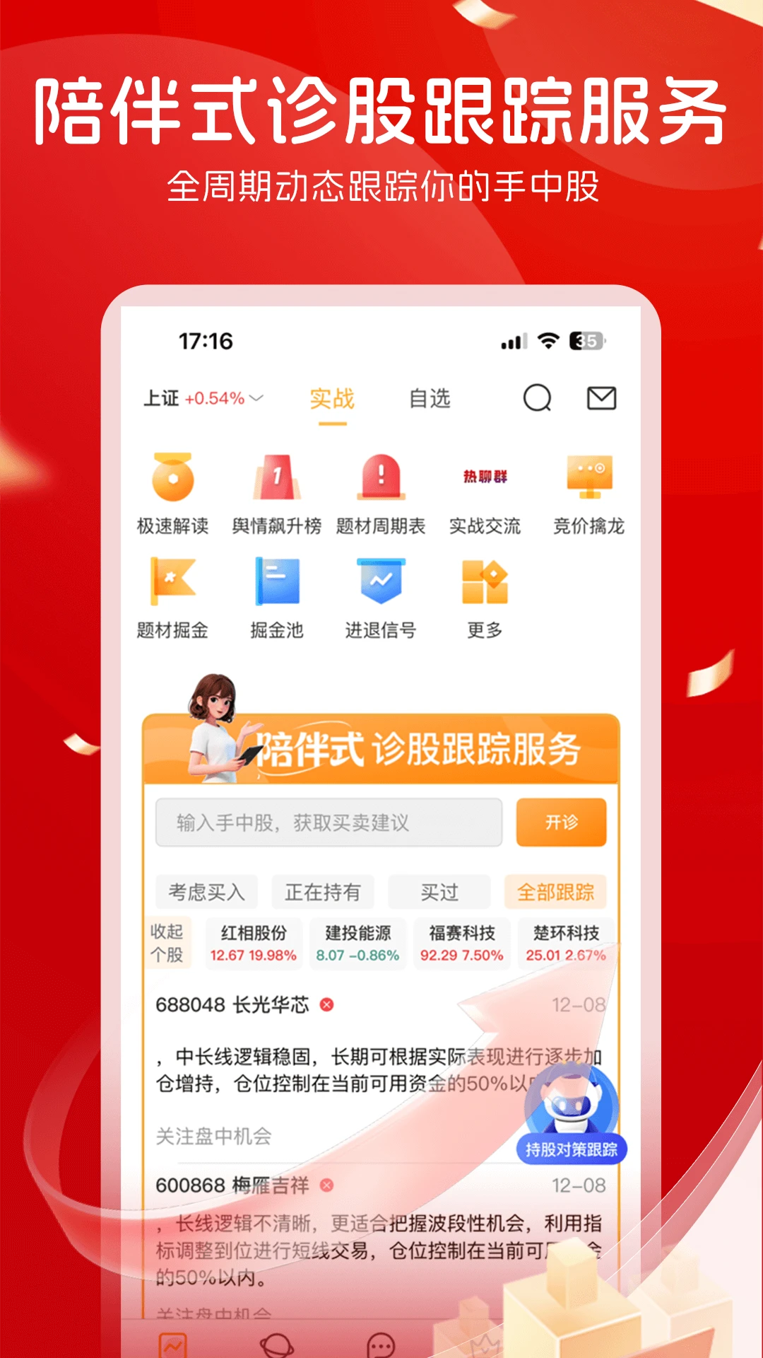 自选股智能盯盘:用户可以添加自选股,持股帮会实时监控这些股票的行情、要闻和公告,并及时提醒用户未来可能出现的异动。