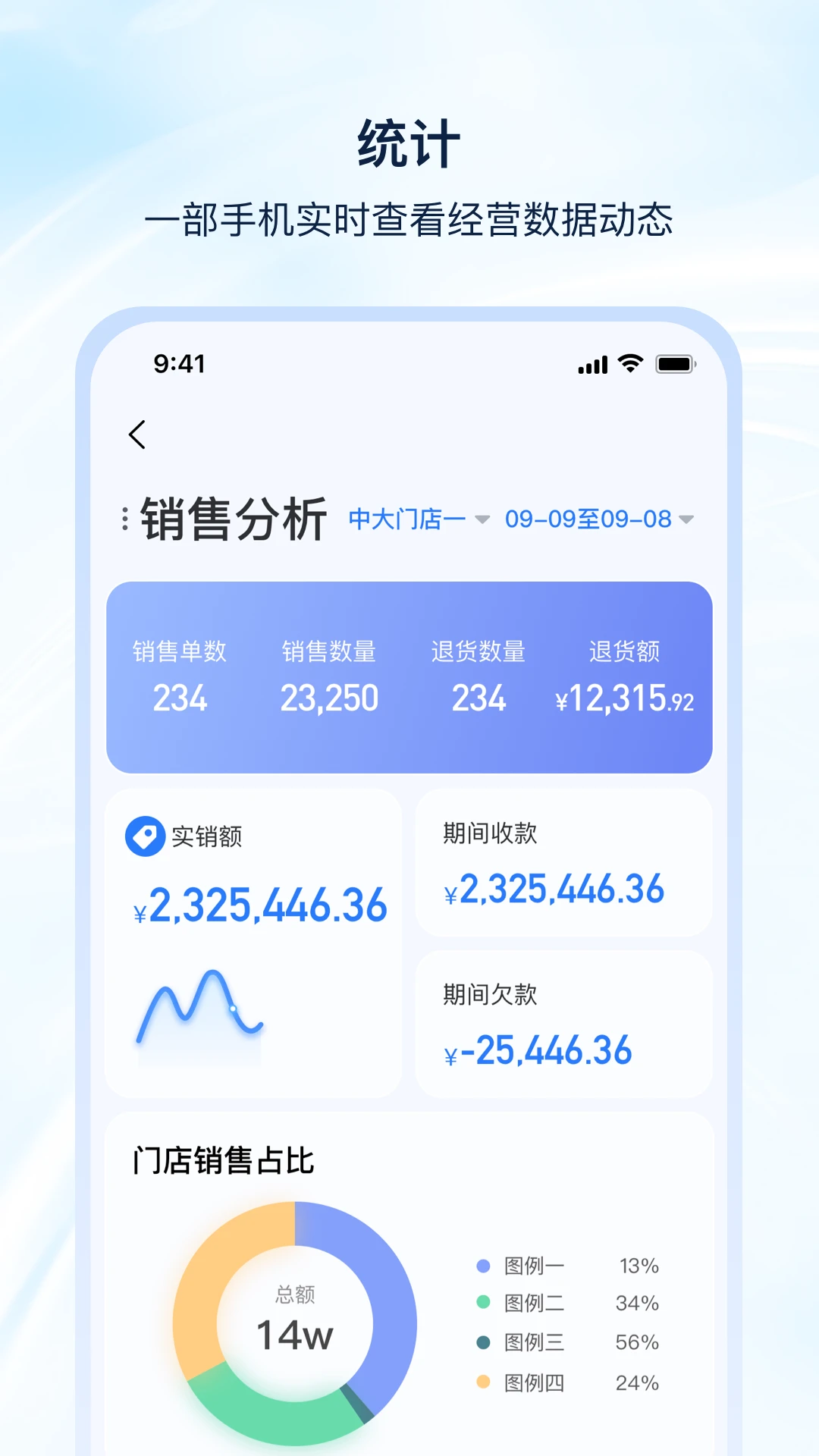 数据统计分析:自动生成销售额、利润率等核心报表,支持自定义筛选维度。