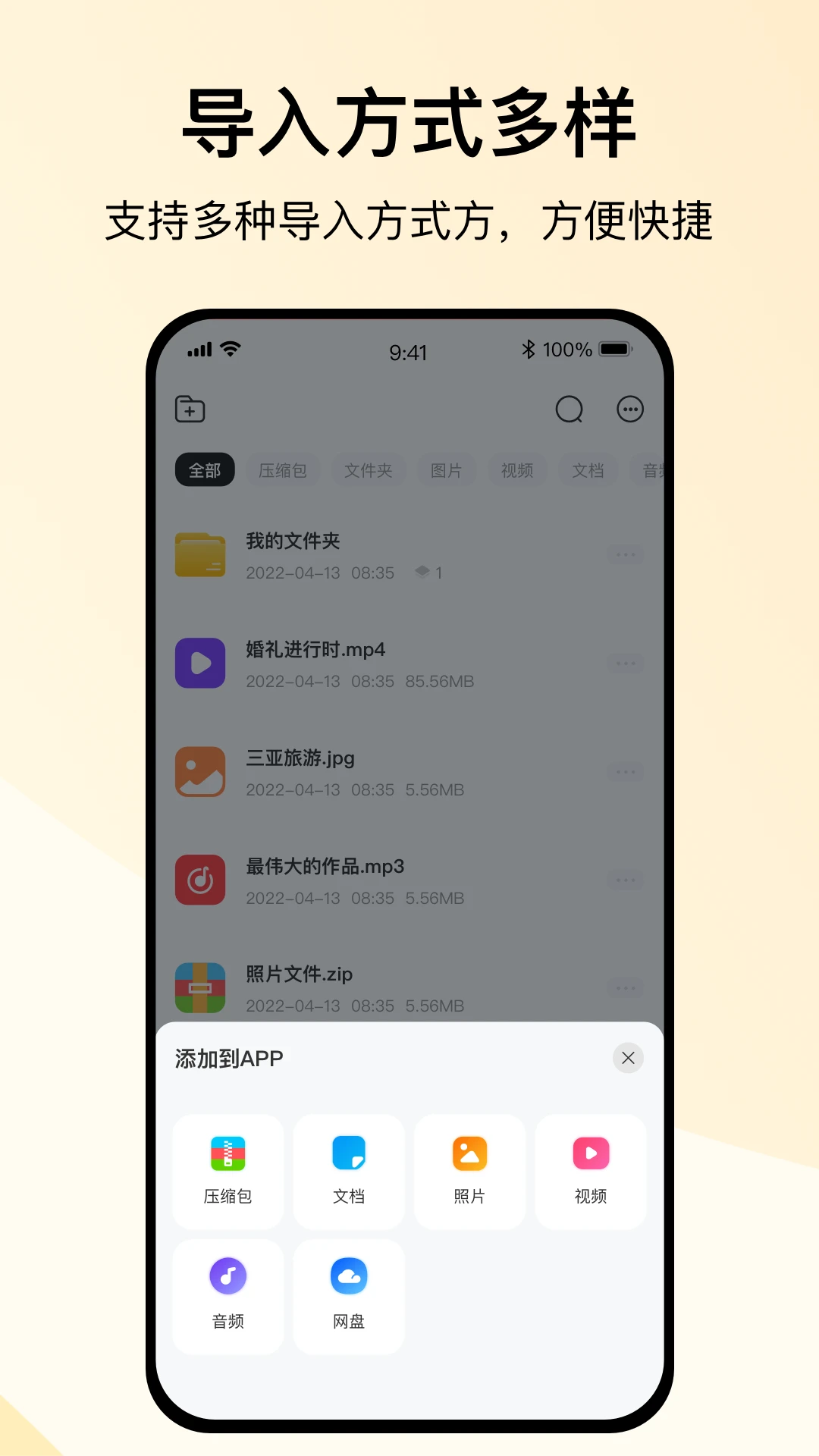 支持导入各类文档、照片、视频、办公文档,满足用户多样化的文件管理需求。