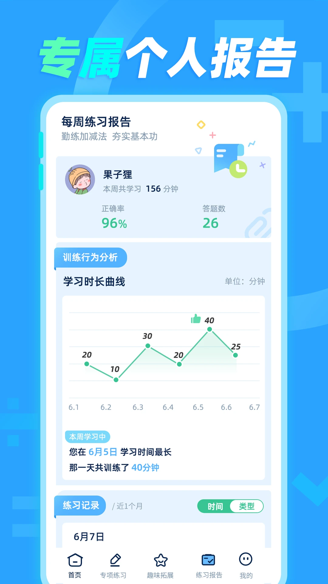 4.专属联系报告,了解自身每周的练习详情。