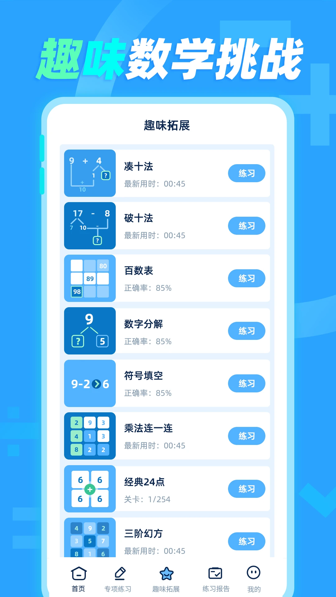 40+专项练习分阶段精细化设置口算计算题,帮助用户精准训练对应知识点