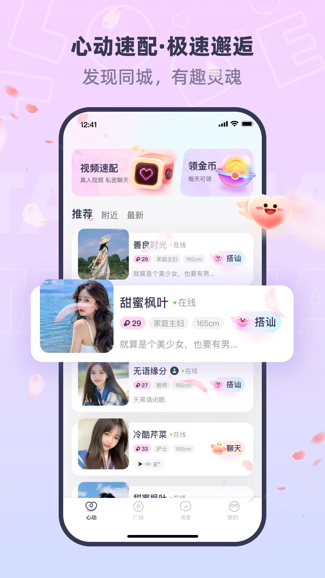 在这里,汇集了海量同城男女,你可以在线畅聊日常、开启陌生视频交友、相约同城线下约会,也能通过匹配找到心仪的恋爱对象,不管是想找个伴唠嗑,还是想遇见专属缘分,总有合你心意的TA,快来开启视频聊天,让桃花主动找上门!