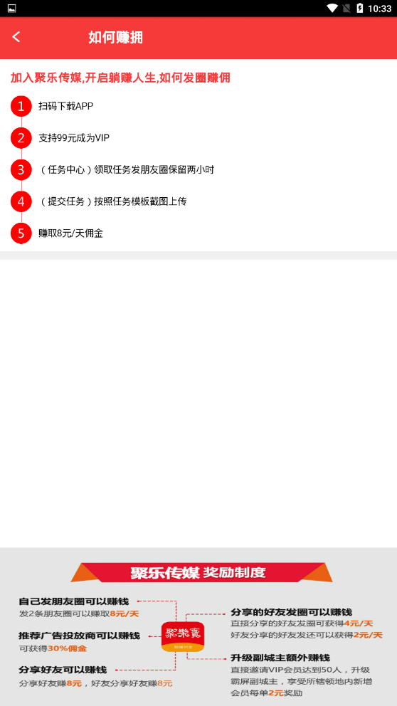 聚乐传媒是一款专为手机用户设计的社交赚钱应用,让您在分享生活的同时轻松获得收益。通过这款app,您只需每天发布几条朋友圈内容,即可赚取丰厚的赏金。更令人惊喜的是,成功邀请好友加入后,还能额外获得他们的奖励分成,实现双赢。聚乐传媒操作简单,收益透明,无论您是学生、上班族还是自由职业者,都能在碎片化时间中创造价值。立即下载体验,开启您的轻松赚钱之旅!