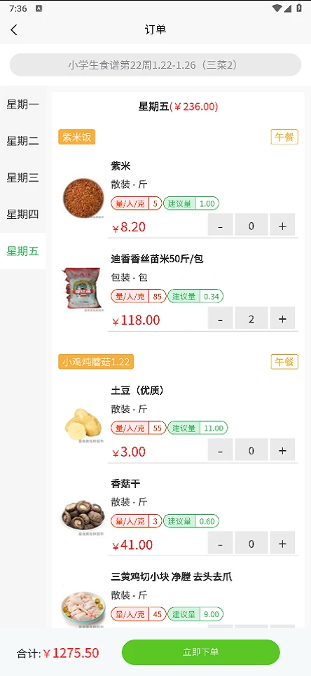 食材搭配方案:结合食谱自动生成食材采购清单,减少人工筛选时间,提高采购效率。