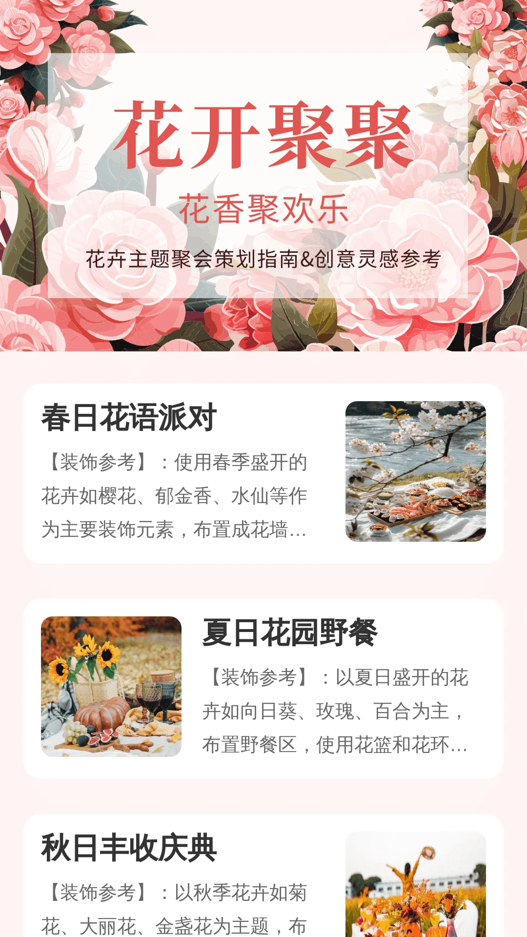 花卉主题策划方案库:提供数十种不同风格的花卉主题方案,涵盖生日派对、婚礼、周年庆等各类聚会场景。