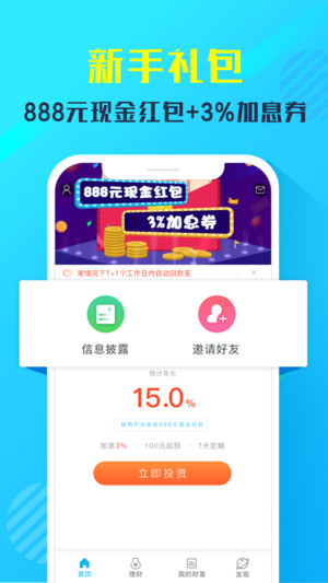 新用户注册即可免费领取888元现金红包,开启您的财富之旅。首次投资理财可享受超高15%年化收益率,额外再加3%的加息优惠,让您的资金快速增值。平台还准备了价值万元的豪华旅游基金、9999纯金金条以及最新款品牌手机等丰厚奖品,参与活动就有机会赢取。更多惊喜优惠持续更新中,立即下载惠财APP,开启您的财富增值之路,让每一分钱都发挥最大价值。