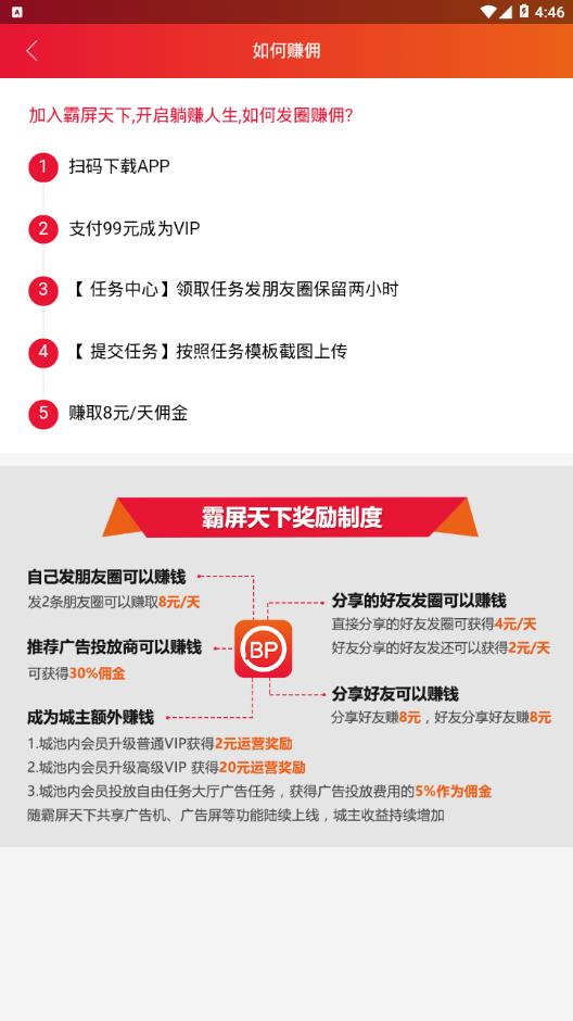 扫码下载APP后,支付99元成为VIP会员即可开启赚钱模式。在任务中心领取任务后,按照要求发布朋友圈并保留两小时,然后按照任务模板截图上传提交任务,就能轻松赚取8元/天的佣金。用户每天发布2条指定朋友圈内容,就能稳定获得8元收益。邀请好友加入还能获得额外收益,直接分享的好友发圈可获得4元/天奖励。推荐投放商更能获得30%的高额佣金分成。当直接邀请的VIP会员达到50人时,还能升级为副城主,享受所辖领地内新增会员的每单2元奖励。通过多级推荐机制,让用户的收益实现指数级增长。