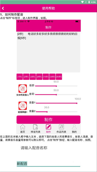 在上面的文本输入框中输入文本,选择下面的发音人和背景音乐,发音人语速、音量、背景音乐音量等参数可以默认即可。点击制作按钮,输入配音名称。系统提供智能参数推荐,帮助用户获得最佳配音效果。