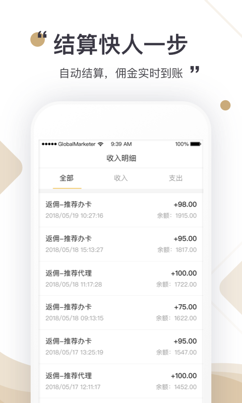 - 平台采用智能结算系统,所有佣金自动计算、实时到账,完全省去人工查询的麻烦。资金到账后可直接提现至银行卡,最快3分钟即可完成整个流程。系统还提供详细的收益报表,让您随时掌握收入情况。