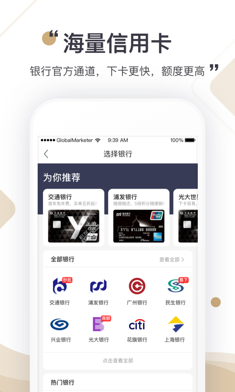 环球推手全新升级版重磅上线!平台现已接入包括工商银行、建设银行、招商银行等在内的30多家主流银行信用卡服务,为用户提供从申请到审批的全流程在线服务。通过环球推手,您可以足不出户完成信用卡申请,享受7×24小时不间断的金融服务。
