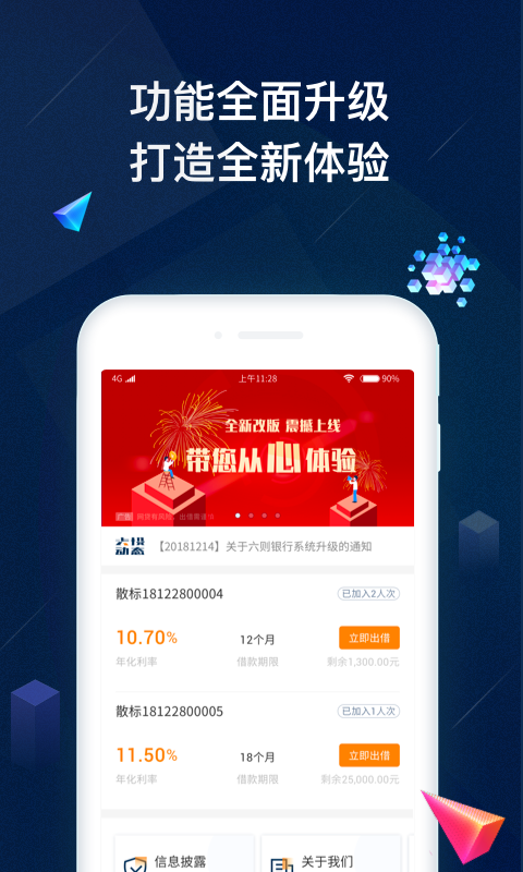 去投网P2P投资平台是一款专业的互联网金融服务软件,致力于为用户提供安全、高效、便捷的网络借贷信息中介服务。平台凭借其强大的技术实力和严格的风控体系,赢得了广大用户的信赖。去投网不仅拥有先进的大数据风控系统,还接入了银行资金存管服务,确保每一笔交易都安全透明,让您的出借和投资更加安心、放心。