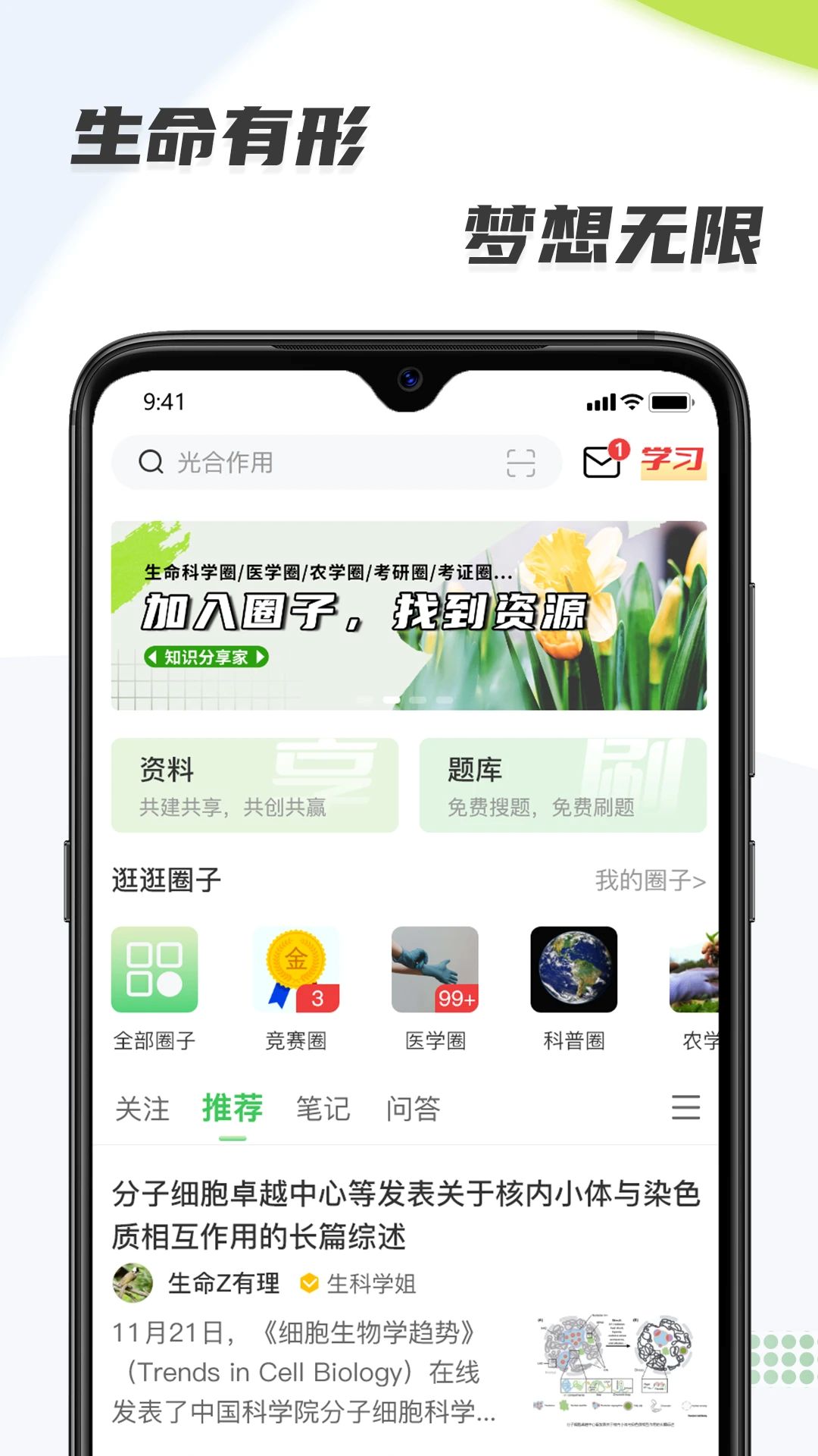 生物圈app是一款专业的生物学知识分享平台,致力于成为生命科学、医学、农学等领域用户的专属学习社区。平台精心打造了大讲堂、学习笔记、专业问答、资料库、题库等多个特色频道,旨在为学生提供优质的学习资源和拓展视野的机会,为教师、科研人员和专业技术人员搭建学术交流与技能分享的平台,同时也为自然爱好者创造了一个互动交流的欢乐空间。