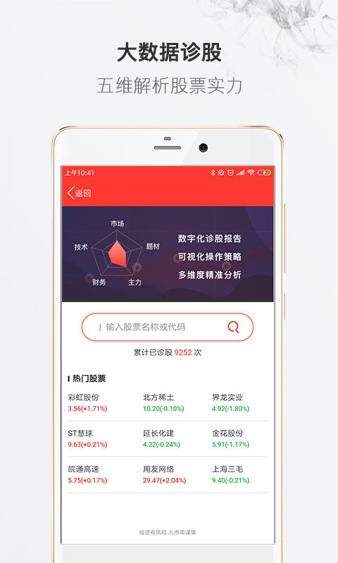 通过市场、技术、主力、财务、题材五个板块综合分析股票实力及市场竞争力,精准分析买卖点,一键诊断股票,涨跌早知道。系统整合了超过20个维度的数据指标,诊断准确率高达85%以上。