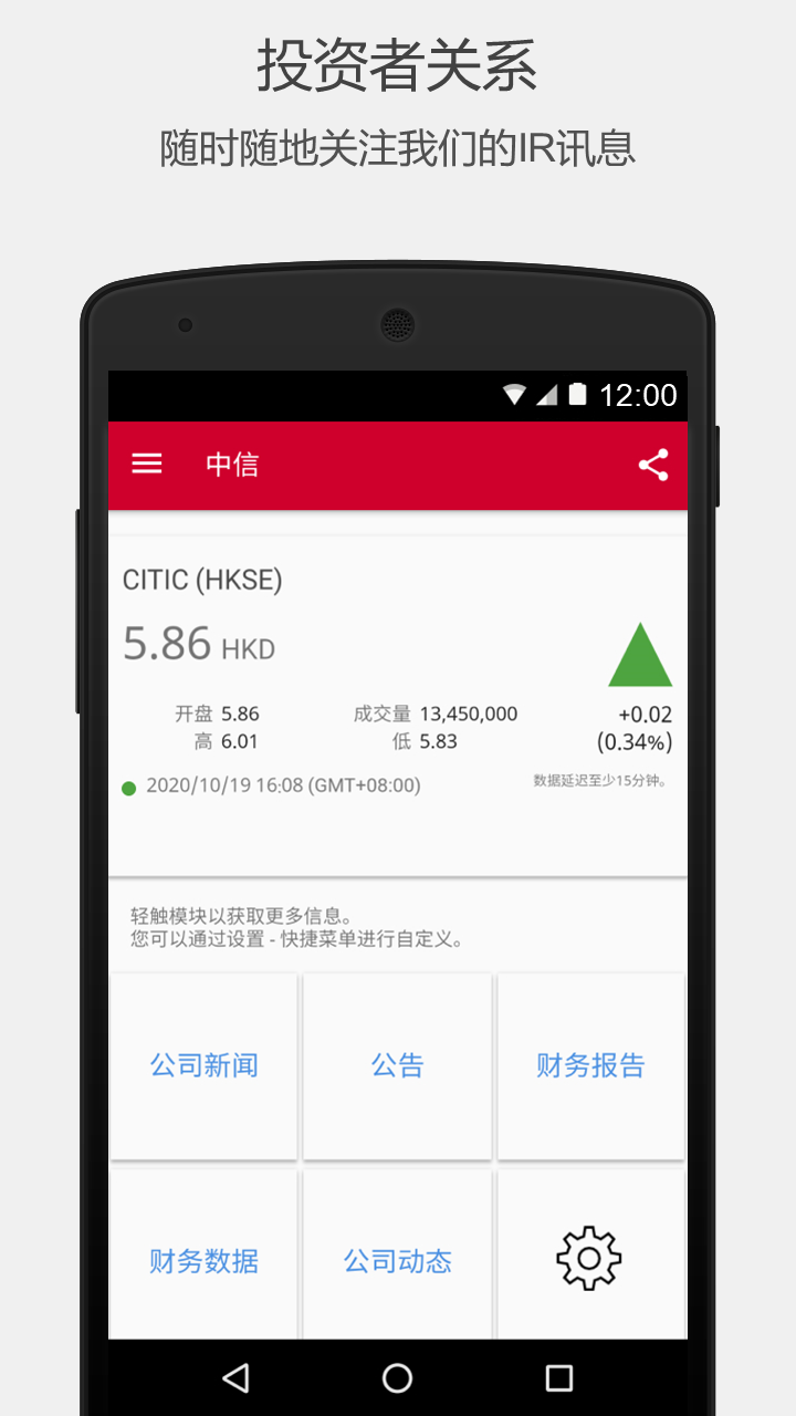 CITICIRApp是一款专为投资者设计的智能金融应用,致力于为用户提供全面、高效且便捷的投资信息服务。通过整合公司股票数据、关键财务指标、投资者关系资讯、个性化关注列表以及互动式图表分析等核心功能,该应用能够帮助用户快速获取真实、准确且具有时效性的市场信息,从而做出更明智的投资决策。