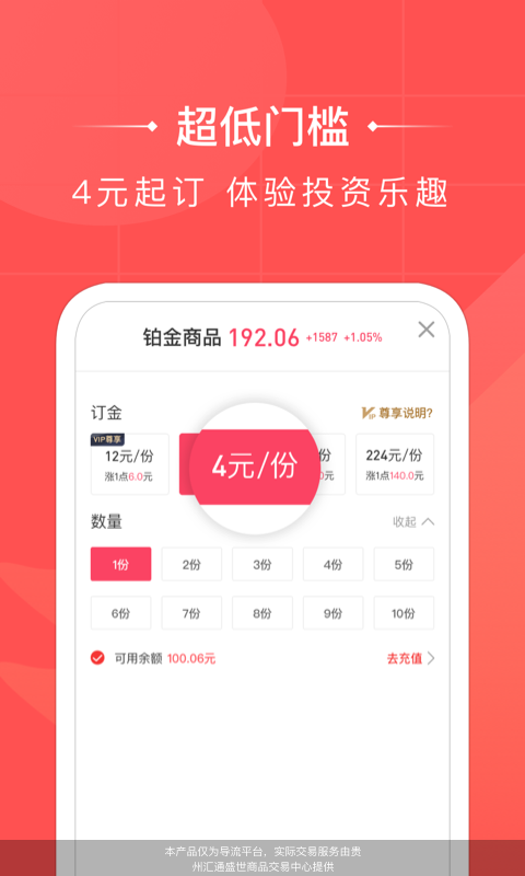 乐盈投资app是一款功能强大且专业的金融投资平台,致力于为用户提供安全、便捷、高效的线上投资服务。该软件由贵州汇通盛世交易中心提供实际交易支持,涵盖贵金属行情查询、线上自由交易、商品订购等多种投资功能。最低4元即可起投,仅需手机号即可快速注册,让投资门槛大大降低,适合各类投资者轻松参与。