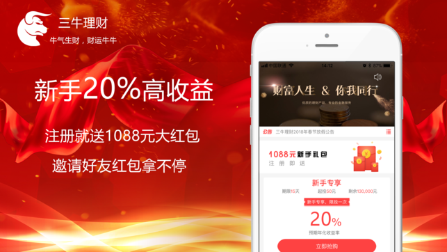 三牛APP作为一款专业的智能理财平台,致力于为用户提供安全、便捷、高收益的投资体验。平台特别推出新手专享福利,注册即赠1088元现金红包,更有20%超高年化收益率等您来拿。我们提供10%-15%年化收益的多样化理财产品,最低50元即可起投,支持灵活存取,所有项目均采用到期还本付息模式,确保收益稳定可靠。每月还会推出限时特惠活动,让您的财富增值更轻松。