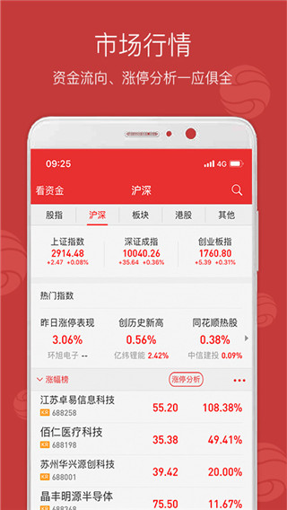 行情排名:从首页点击"涨跌排名"默认进入沪深排名榜;向右滑可以进入股指,向左滑进入行业板块,其他;上下滑动查看更多股票。排名数据每3秒自动刷新,确保投资者获取最新市场动态。