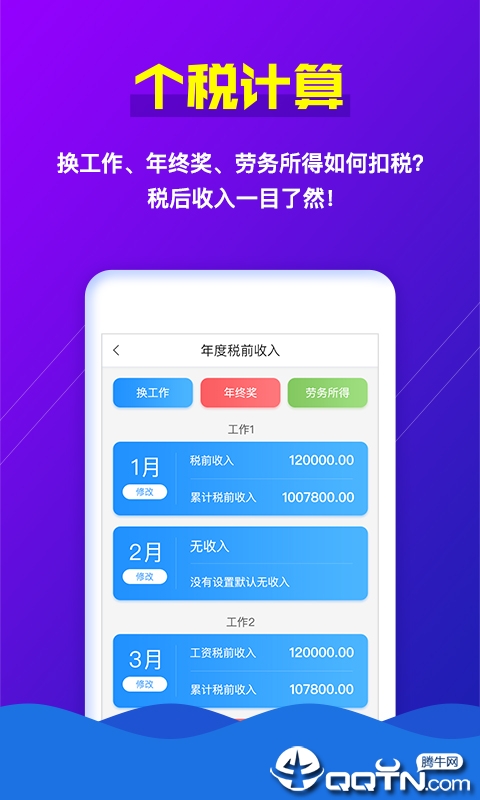 【多元化收入计算】除了常规工资计算,还支持年终奖、劳务报酬、稿酬等各类收入的个税计算,输入税前金额即可获得准确的税后收入,让各类收入情况一目了然。