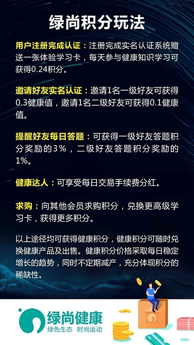 用户完成注册认证后,系统将自动赠送一张体验学习卡,每日参与健康知识学习可获得0.24个基础积分。平台特别设置多层级社交激励机制:成功邀请一级好友完成实名认证可获得0.3健康值,邀请二级好友则可获得0.1健康值。用户还可通过提醒好友每日答题获得额外收益,一级好友答题积分的3%和二级好友答题积分的1%将作为奖励。平台设有"健康达人"荣誉体系,达到相应等级的用户可享受每日交易手续费分红。此外,用户可通过积分求购系统向其他会员求购积分,用于兑换更高级别的学习卡,从而获得更丰厚的积分回报。