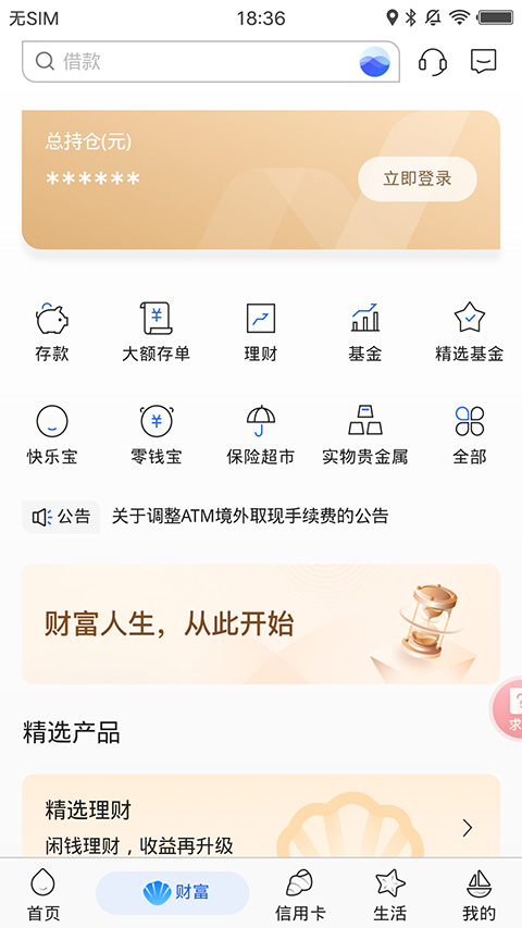 点开财富,用户登陆后可以查看余额,还有各种理财产品供用户选择;