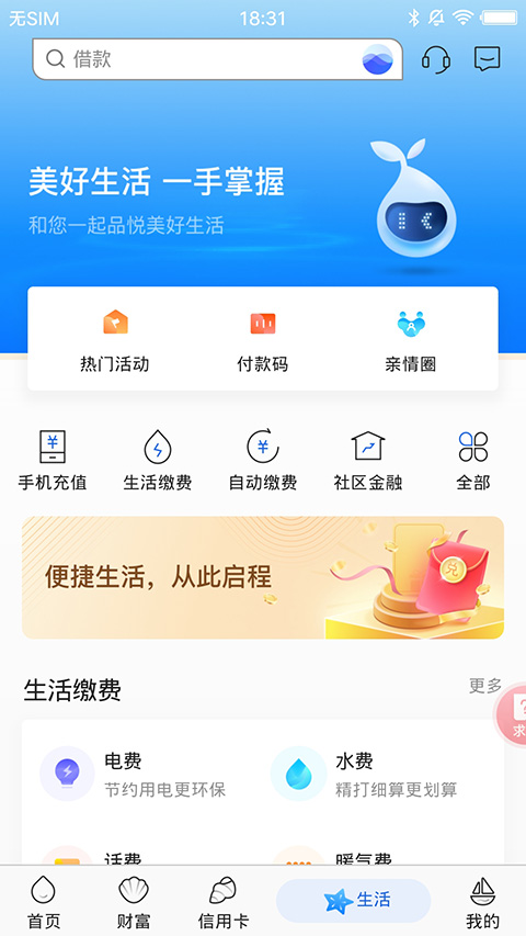 点开生活,拥有手机充值、生活缴费、自动缴费、付款码等功能。