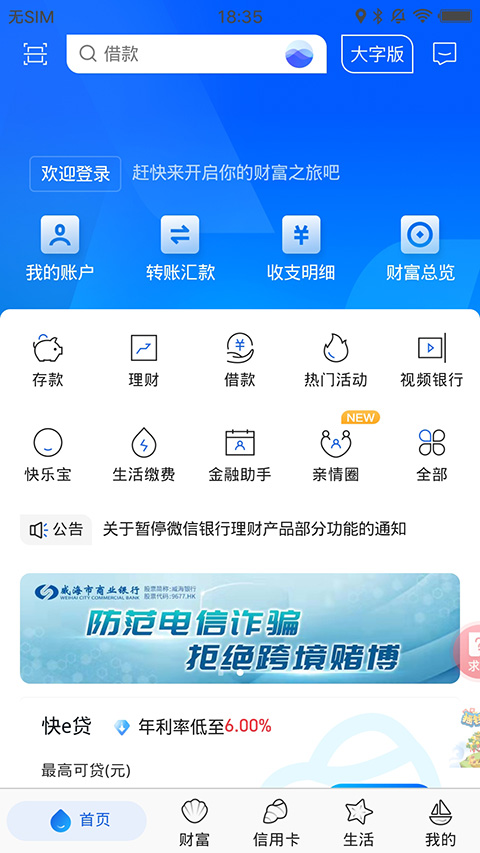 进入软件,在首页,有存款、理财、借款、视频银行、快乐宝、生活缴费等功能;