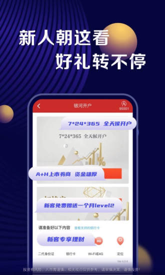 新用户注册即享Level-2行情30天免费使用权,专享6%年化收益的新客理财产品,更有888元交易手续费抵扣券等多重福利。
