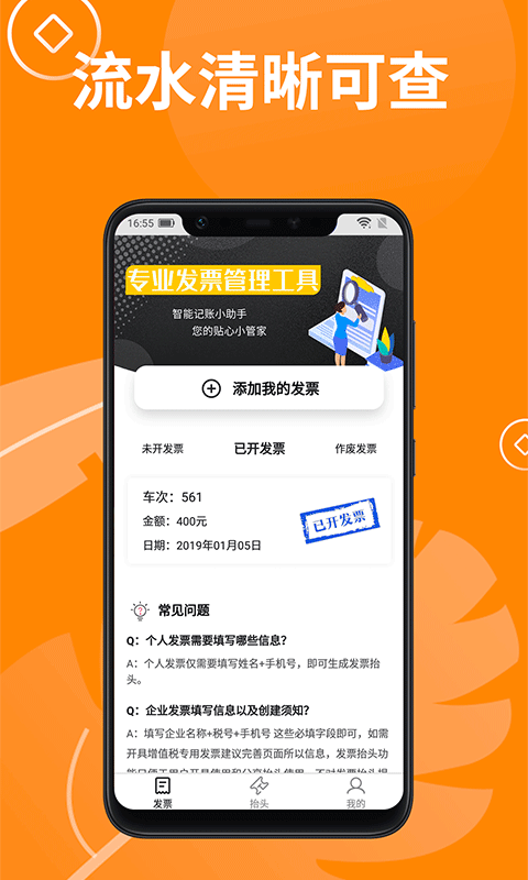 【发票扫码】:只需轻轻一扫,即可快速识别发票二维码,自动录入发票关键信息,省去手动输入的麻烦。