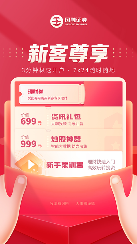 轻松开户:彻底告别传统营业部排队的烦恼,7*24小时全天候服务,3分钟即可完成股票、基金账户开通,更有三重开户好礼相送。