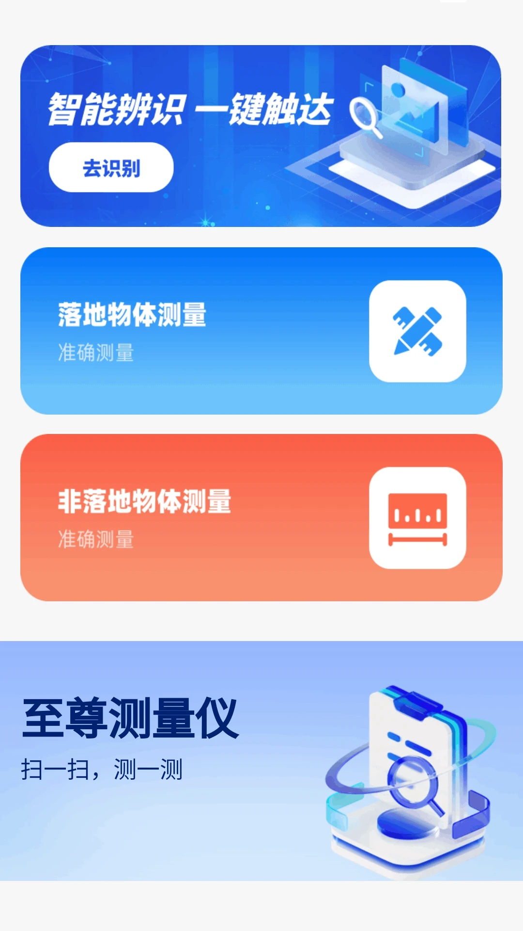 至尊测量仪是一款功能强大的专业扫描APP,集成了多项实用工具,为用户提供便捷的测量与识别服务。无论是动物识别、植物鉴别,还是精准测量落地或非落地物体,这款应用都能轻松应对。通过简单的“扫一扫”和“测一测”操作,用户即可快速获取所需信息,满足日常生活中的多样化需求。无论是专业人士还是普通用户,至尊测量仪都能成为您的得力助手,快来下载体验吧!