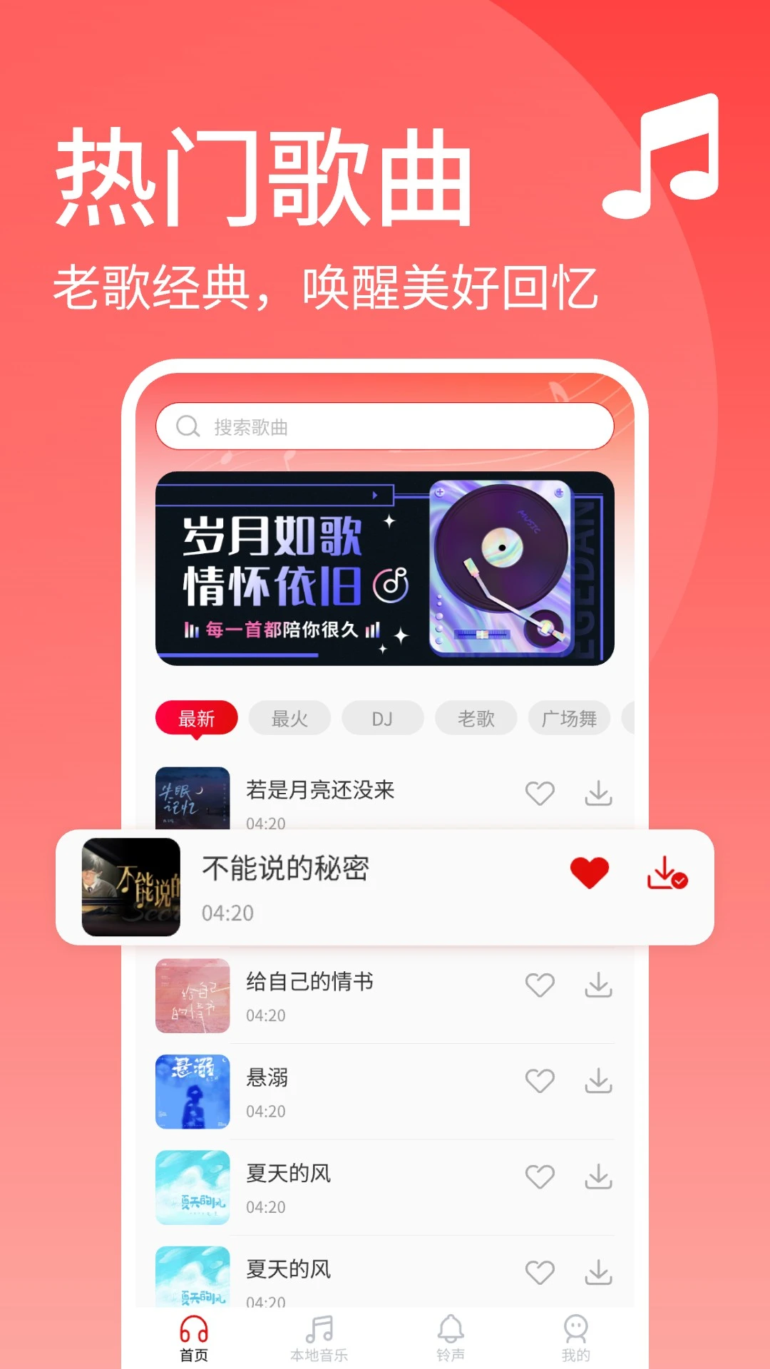 提供热门铃声功能,用户可以从经典老歌中选择喜欢的片段作为手机铃声,让来电更有个性和怀旧感。