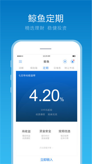 鲸鱼宝作为一款面向大众的安全活期理财产品,凭借其安全性、高收益、低门槛和灵活性等特点,已成为日常理财的理想选择。平台独立规范运营,通过购买平安集团旗下陆金所的优质债权产品,并将其转化为灵活便捷的活期理财形式,为用户提供更多元化的投资选择。这种创新的业务模式实现了本息双保险,确保100%安全兑付,让投资者可以完全放心。