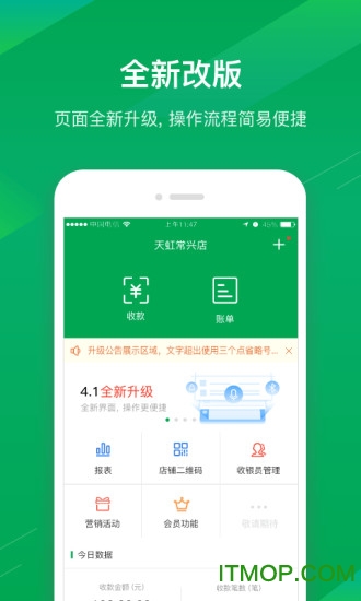 新增在线客服;九宫格解锁快速登录;支持绑定云播报设备;优化打印小票功能;新增交易备注功能;修复了已知的系统bug,提升了应用运行稳定性。